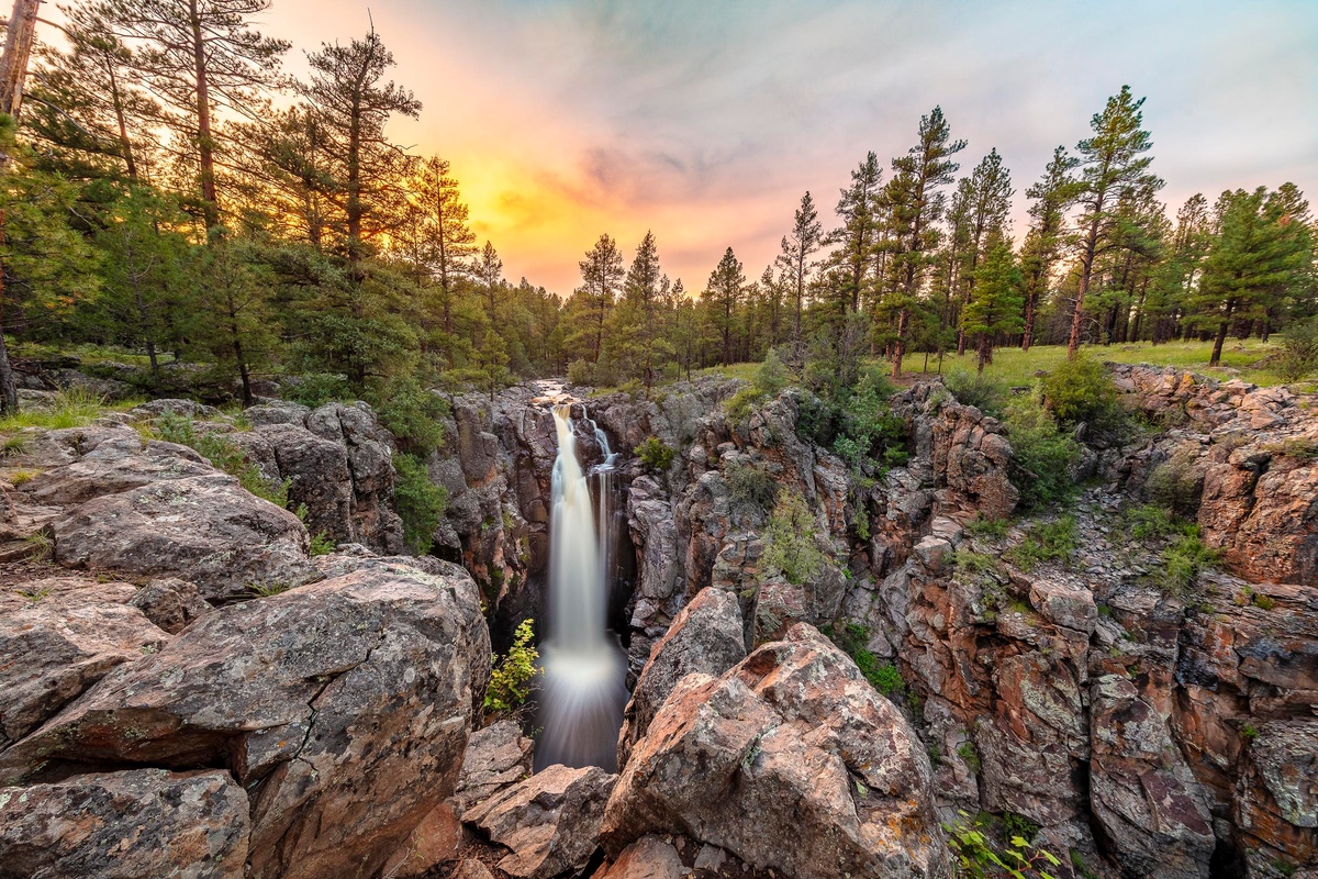 Sunset at Sycamore Falls by Byron Neslen Photography is a captivating portrayal of nature's serene beauty between Flagstaff and Williams, Arizona. This stunning photograph captures the tranquil moment of sunset, where the last light of the day bathes the landscape in warm, golden hues. The majestic waterfall cascades down rugged rock formations, surrounded by a lush forest of tall pine trees. The smooth, flowing water contrasts beautifully with the rough texture of the rocks, adding depth and interest to the scene.