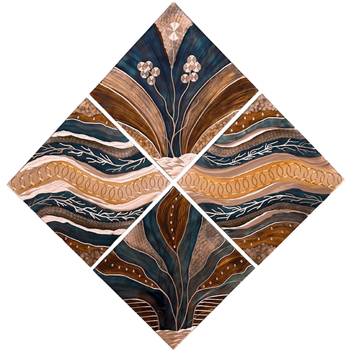 Fountain of Youth by Metal Memories is a captivating four-piece wall decor set that stands as a testament to the beauty and complexity of flame-painted copper art. Each panel forms a quarter of a larger, cohesive diamond shape, arranged in a way that the corners meet at the center, creating a striking visual intersection that draws the viewer's eye inward. The panels are adorned with organic motifs and flowing lines that resemble water and plant life, symbolizing rejuvenation and continuous growth, akin to the mythical qualities of a fountain of youth.