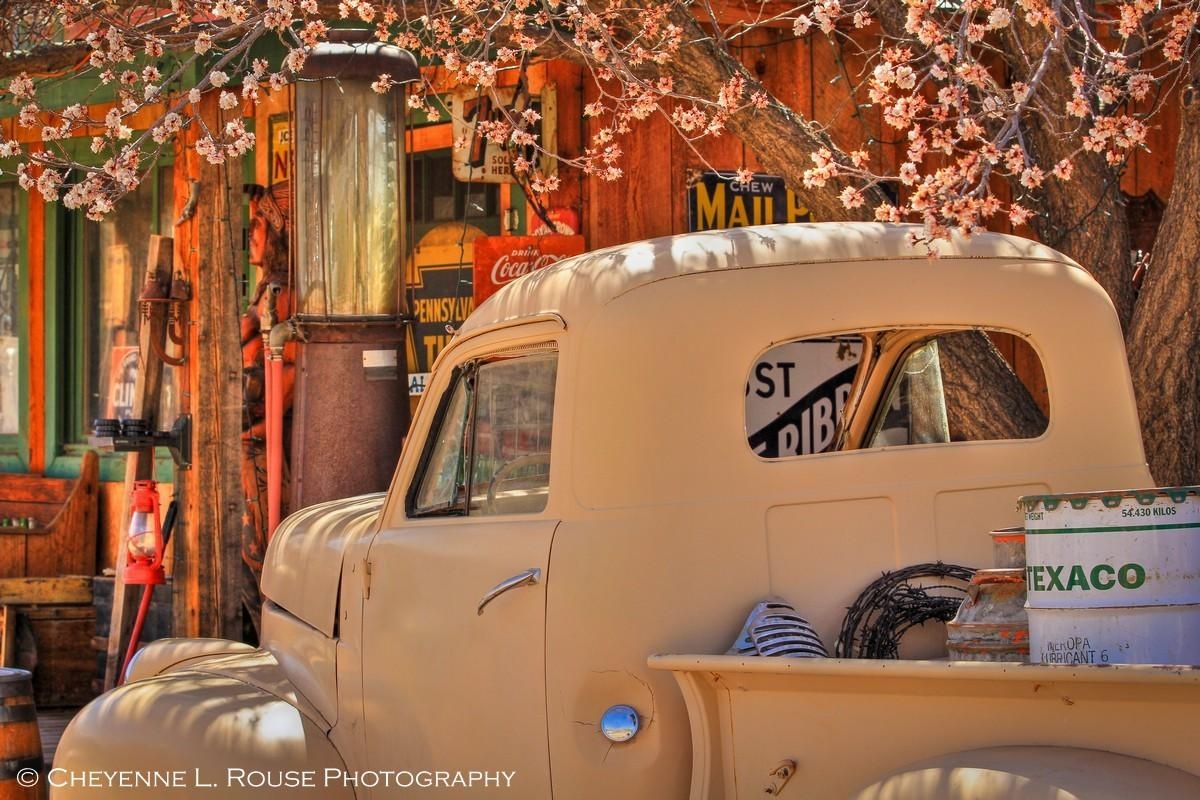 Mayberry Memories by Cheyenne L Rouse Photography is a richly textured photographic print that evokes a sense of American nostalgia. Set against a roadside stop in Northern New Mexico, the image features an old Studebaker truck, a classic symbol of mid-20th-century America. The photograph is bathed in warm light, highlighting the vintage cream color of the vehicle and the rustic backdrop of old signs and gas pumps.