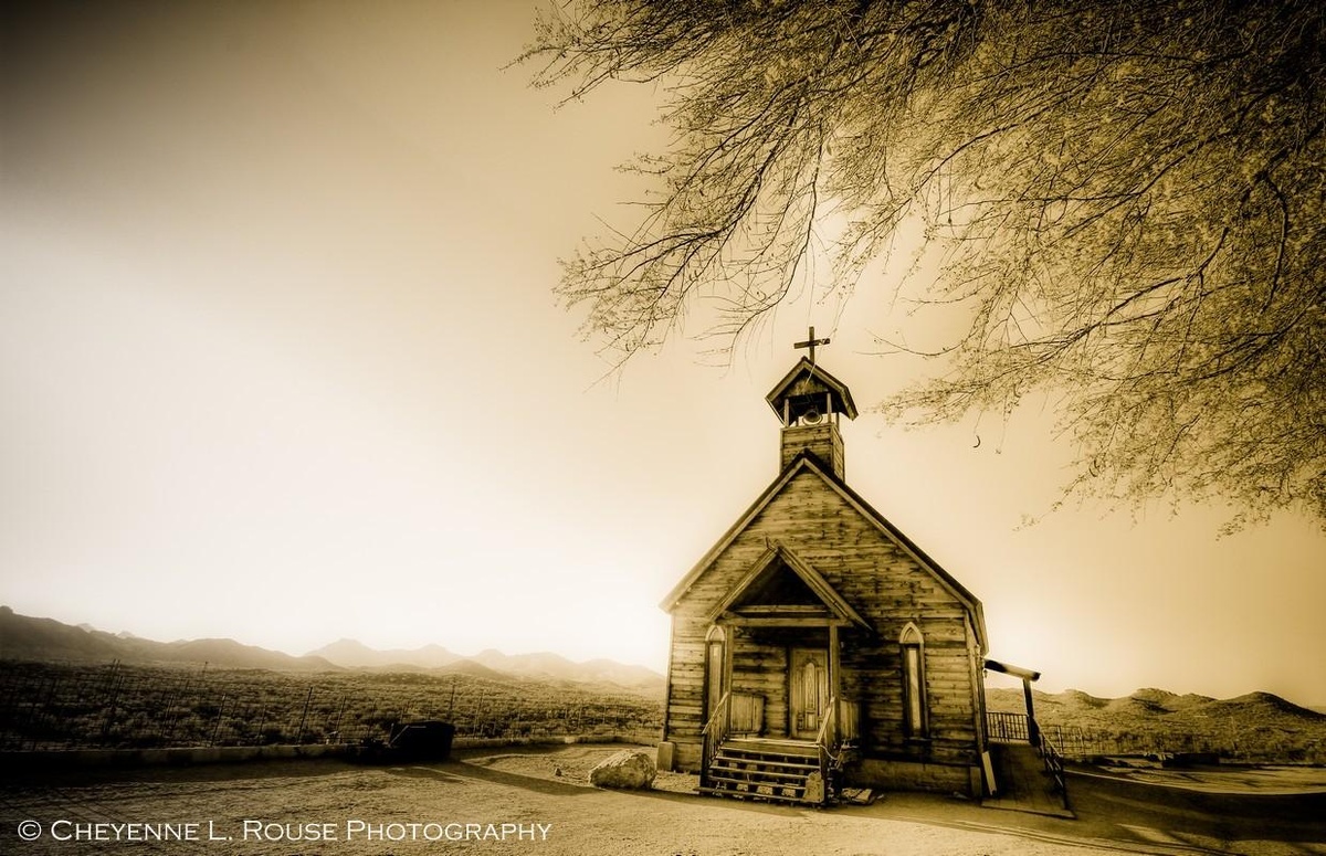 This piece, "Lonesome Chapel," is not just a photograph; it is a historical document, preserving the memory of a vanishing Americana. The chapel, nestled under the expansive desert sky and framed by the embracing limbs of a tree, speaks of solitude and contemplation. Through Cheyenne's lens, the image invites the viewer to listen to the whispers of history and nature and to explore the profound silence and stories that the photograph resonates with.