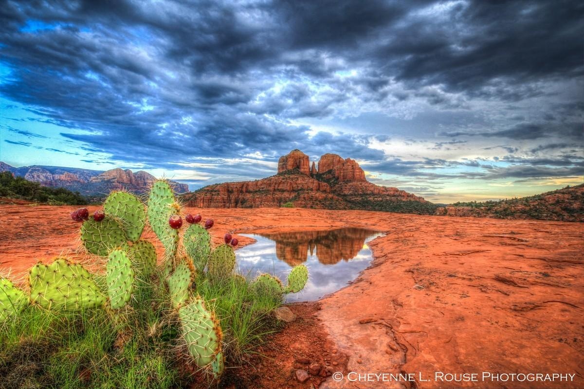 The focal point is a cactus adorned with rich, red fruit, standing as a sentinel in the foreground, while the iconic Cathedral Rock is skillfully reflected in the mirror-like pool, creating a symphony of symmetry and color. Rouse's masterful use of High Dynamic Range (HDR) technique brings out the depth and detail of the scene, allowing viewers to feel the texture of the earth and the movement in the sky.