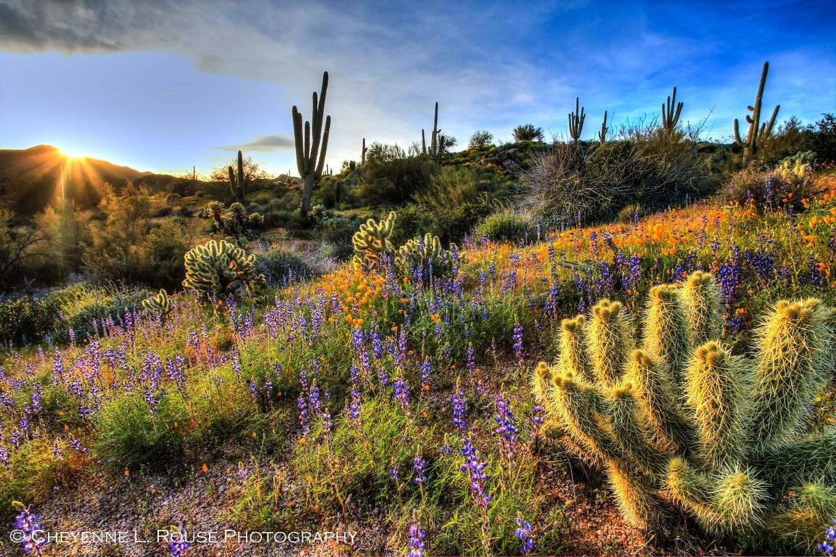 Rouse's composition expertly balances the wild, organic beauty of the desert with the quiet drama of the sunset, creating a scene that is both dynamic and serene. Her use of High Dynamic Range (HDR) imaging allows for an extraordinary depth of detail, from the soft fuzz of the cholla cactus to the intricate patterns of the wildflowers' petals.