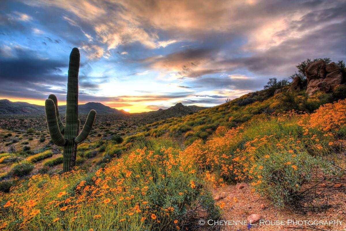 The image is a rich tapestry of contrasts: the vivid wildflowers against the subdued tones of the desert terrain, the rough textures of the cactus against the smooth sweep of the clouds, and the fleeting light of dusk against the enduring forms of the landscape. Cheyenne’s use of HDR imaging captures this scene with a remarkable clarity and depth, inviting the viewer to explore every aspect of this dynamic environment.