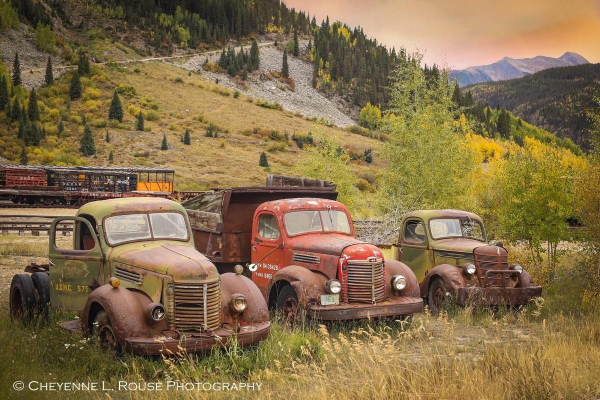 Legends of the Fall by Cheyenne L Rouse Photography is a nostalgic photograph that beautifully captures the essence of autumn in Silverton, Colorado. This composition features a trio of rustic International trucks, their weathered exteriors telling tales of a bygone era, set against the natural splendor of fall. The patina of the trucks, set amongst the vibrant fall foliage and the timeless backdrop of the Durango-Silverton narrow gauge railroad, evokes a sense of history and the enduring spirit of Americana.