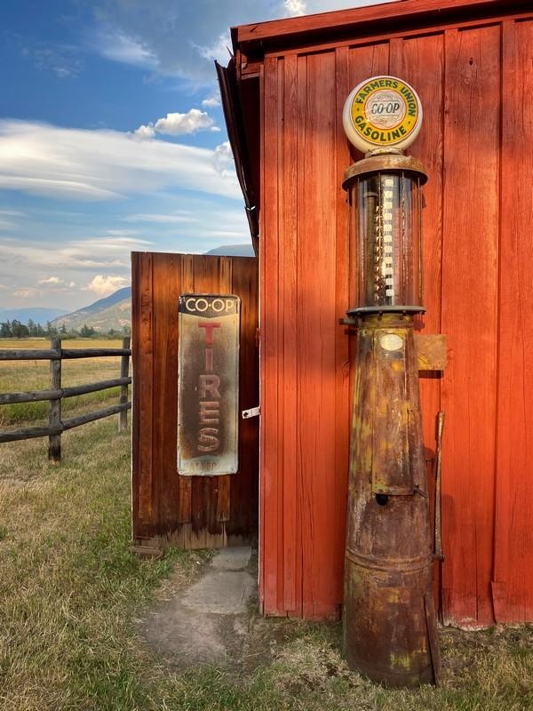 The photograph's composition masterfully balances the man-made artifacts with the natural beauty of Montana's expansive skies and distant mountains, hinting at the vastness and untouched nature surrounding these relics of human ingenuity. The warm glow of the setting sun highlights the textures and patina of the gas pump and sign, while the contrasting colors create a striking image that draws the viewer into a contemplative journey through the past.