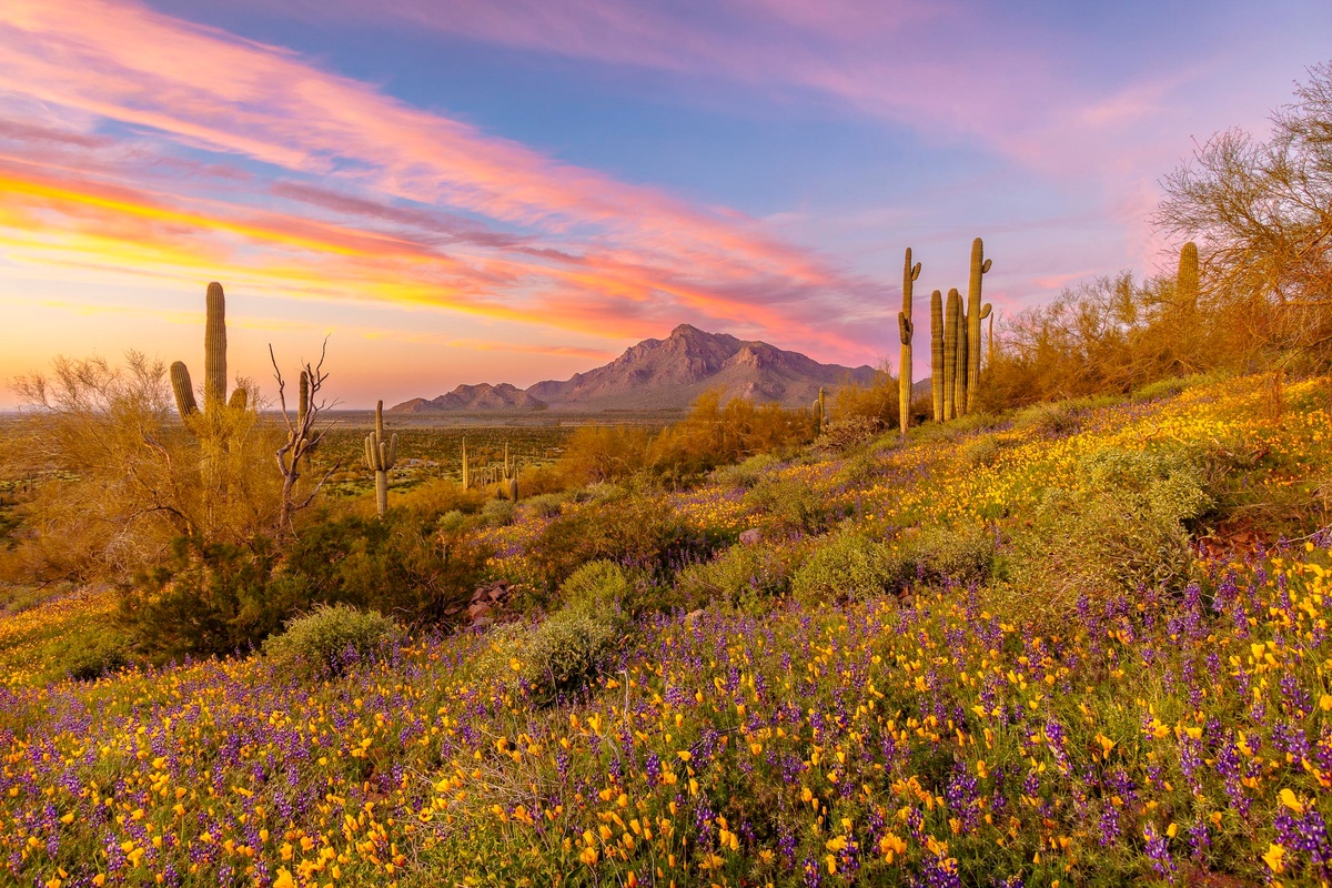 Step into the enchanting desert landscape with Spring Sunset at Picacho Peak 2 by Byron Neslen Photography. This exquisite photograph captures the breathtaking view of Mexican poppies and lupine in full bloom at Picacho Peak, nestled between Tucson and Phoenix, Arizona.