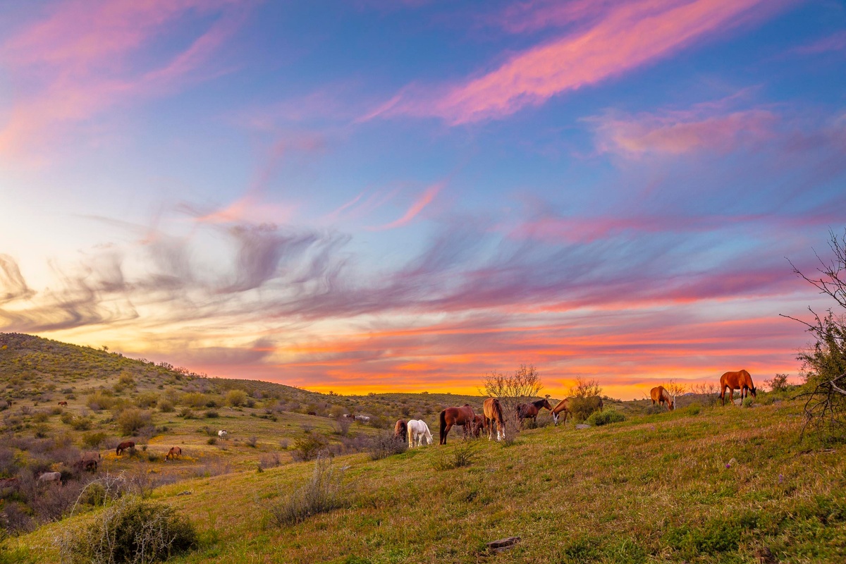 - Captures the tranquil beauty of Salt River horses at sunset.