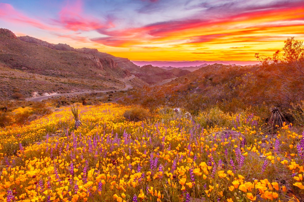 Old Route 66 Spring Sunset by Byron Neslen Photography immerses viewers in the enchanting landscape of Oatman, Arizona, where the historic highway 66 winds through a vibrant tapestry of wildflowers. This photograph captures a mesmerizing sunset, with Mexican Poppies and Lupines in full bloom, their colors intensified by the fiery hues of the setting sun. The sky's vivid display of pinks, oranges, and purples casts a magical glow over the scene, highlighting the rugged beauty of the desert terrain.