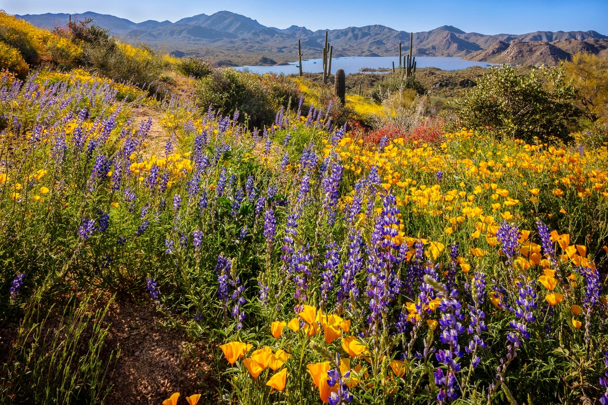 Neslen's exceptional eye for detail and composition is evident in this piece. The photograph draws the viewer's gaze across the expanse of wildflowers, leading towards the distant mountains and the serene lake nestled among the cacti and desert vegetation. The interplay of light and shadow enhances the depth and richness of the landscape, bringing the vibrant colors and textures to life.