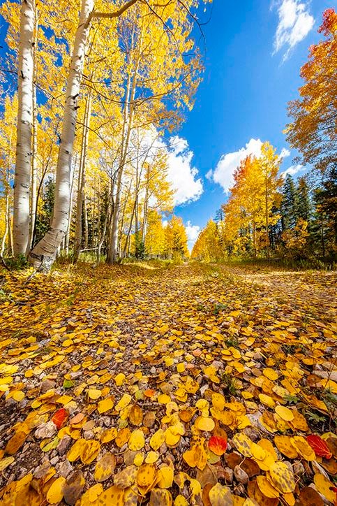 Autumn Leaves on Kaibab Forest Road by Byron Neslen Photography beautifully captures the serene and vibrant essence of autumn on the Kaibab Forest North Rim of the Grand Canyon, Arizona. This stunning photograph showcases a dirt road blanketed with a carpet of golden leaves, creating a breathtaking pathway framed by towering aspen trees in full fall foliage. The bright blue sky above adds a striking contrast to the warm yellows and oranges of the leaves, enhancing the image's overall vibrancy.