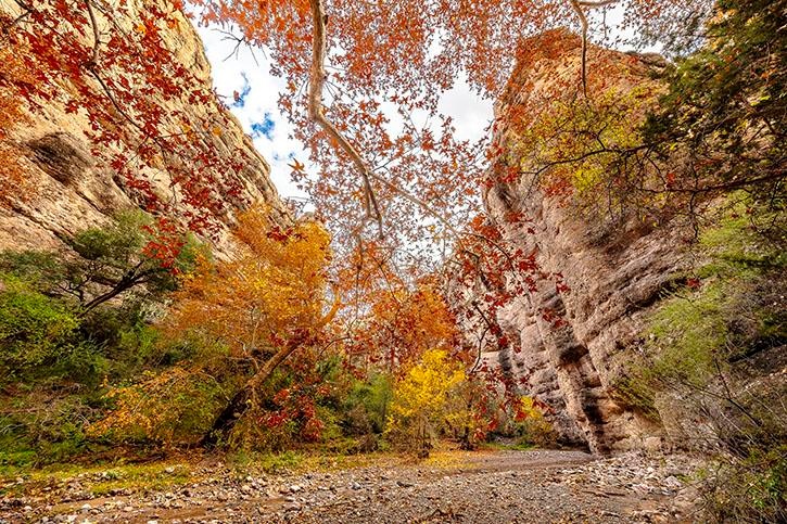 Neslen's meticulous attention to detail is evident in the way he captures the textures of the canyon rocks and the delicate intricacies of the foliage. The canopy of colorful leaves frames the scene perfectly, drawing the viewer's eye upward and providing a sense of depth and scale. The creek bed, dotted with pebbles and fallen leaves, adds to the natural, untouched feel of the image, making it easy to imagine the gentle sounds of water trickling and leaves rustling in the breeze..