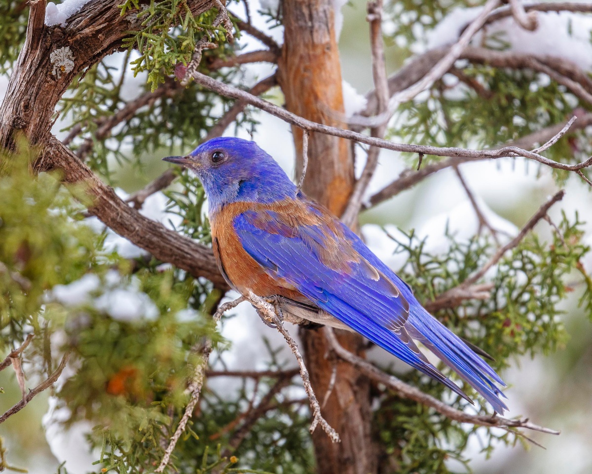 Western Bluebird Winter by Byron Neslen Photography beautifully captures a serene winter moment featuring a Western Bluebird perched in a juniper tree near Sedona, Arizona. The bird's vibrant blue and rusty orange plumage contrasts strikingly with the muted, wintry background, creating a visually stunning composition. The snow-dusted juniper branches add an extra layer of texture and depth to the scene, enhancing the tranquil, cold atmosphere of the winter landscape. Neslen's skillful use of natural light and focus brings out the intricate details of the bird's feathers, making it the focal point of this captivating image.