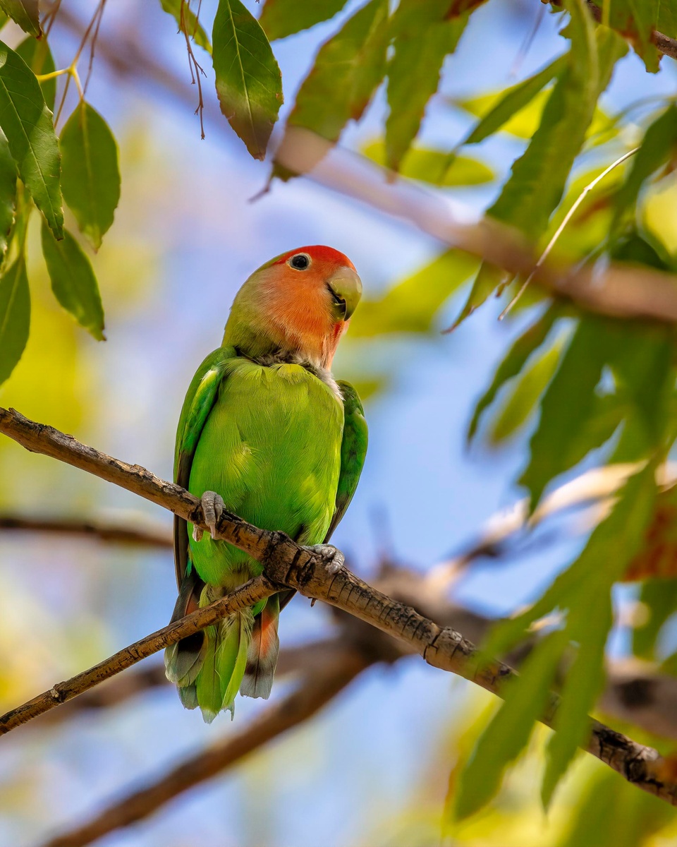 Peach Face Lovebird by Byron Neslen Photography vividly captures a charming Peach Face Lovebird perched gracefully in an ash tree. The bird's vibrant green feathers and distinctive peach-colored face stand out brilliantly against the lush green leaves and the soft blue sky. This close-up shot highlights the intricate details of the lovebird's plumage, showcasing its delicate textures and striking colors. The composition and natural lighting create a serene and intimate portrait of this beautiful bird in its natural habitat.